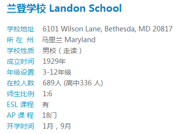 兰登学校 Landon School是一所独立的全日制私立男校,无宗教背景,设立3年级至12年级,为学生提供有挑战性的大学预备课程学习。创始人Paul Landon Banfield建校于1929年,并担任校长职位逾40年。1935年从最初校址华盛顿特区的大使街迁至目前所在地马里兰州的贝赛士达,这里至今仍被称作全美最富裕、受教育程度最高的地区之一。学校的教育质量反映出对正直、个人责任感、文明、社会荣誉感及体育精神等方面的重视。75英亩的校园和众多现代化设施,保证了学生们在学术能力进步的同时发展体育技能。