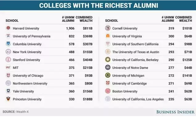 在“Wealth-X”的概念中,所谓“亿万富豪”,是指那些个人资本净值在1亿美元以及以上的人们。据其统计,在全球将近三百万人当中,才出1个亿万富豪。那么,他们毕业于哪些高校?高校又与其财富创造有哪些关联呢?