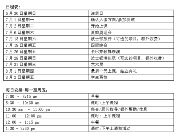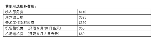 整个上午的课程和讲习班、整个下午的课程和活动、餐费、带家具的宿舍(只供寄宿学生使 用)、所有书籍和用品(工作室艺术用品会有额外费用)、制服、五周健康保险金(只限寄宿学 生)、亚麻床单(只供寄宿学生使用)、校园社交及体育活动、所有校外活动和远足的公共汽 车交通、教育实地考察和波士顿港口巡航