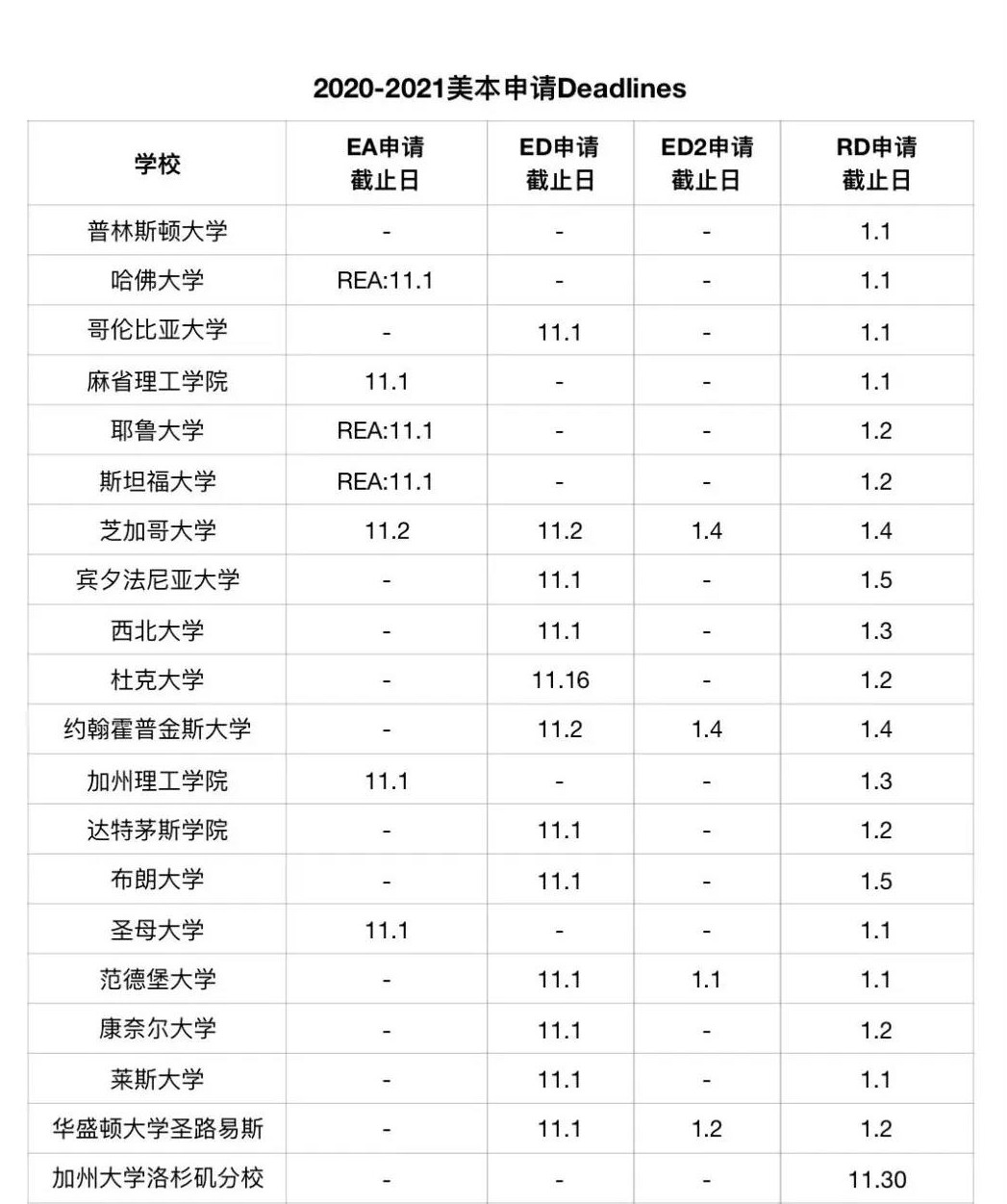 2020-2021美本申请截止时间