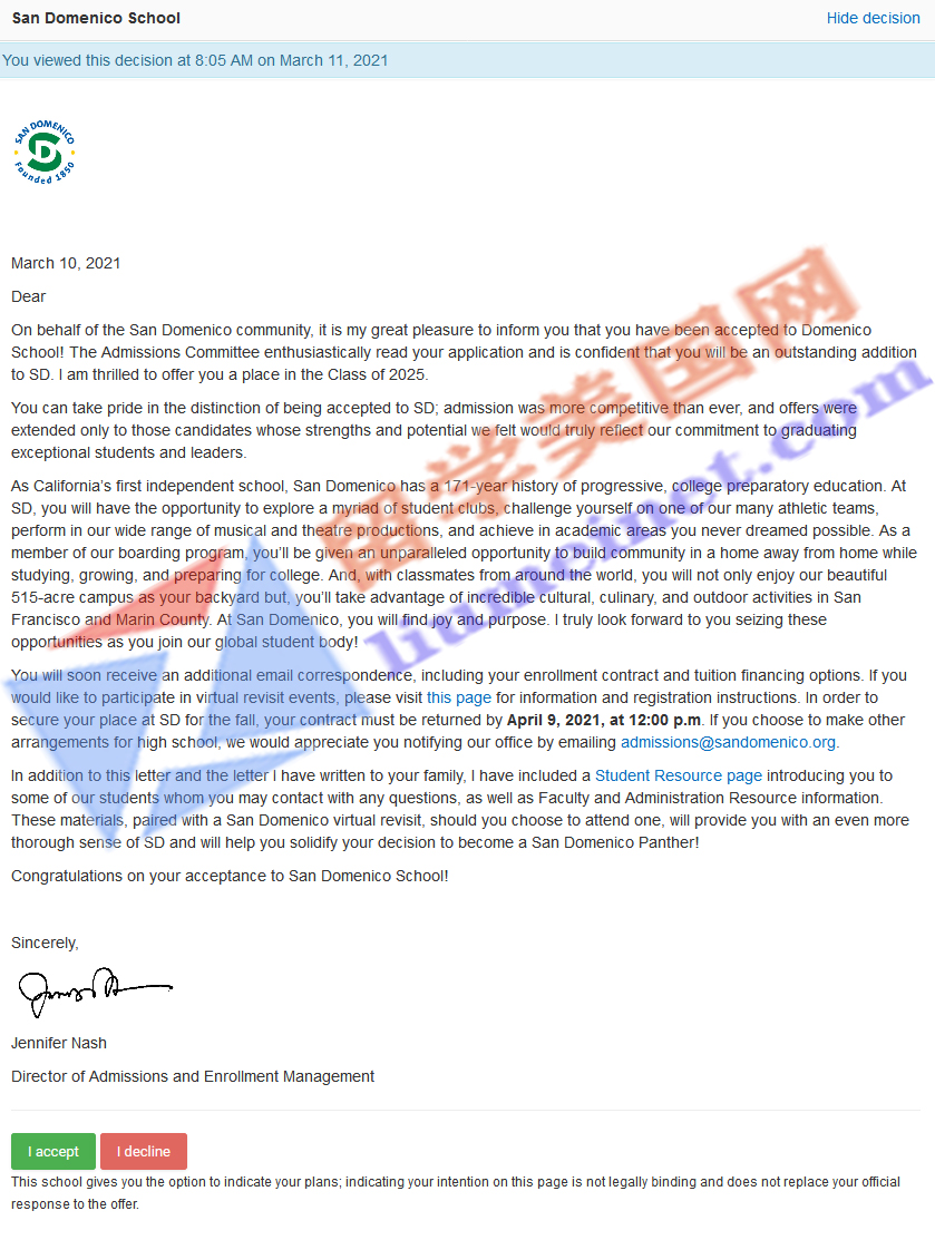 录取捷报 | 恭喜留美网S同学斩获美国寄宿高中圣多明尼哥中学San Domenico School的录取offer~