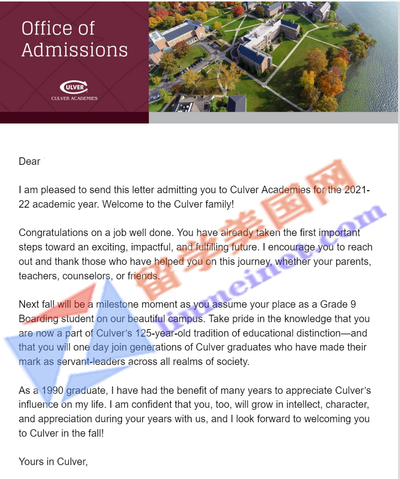 Z同学哥哥是通过留美网申请的,因此在他申请的时候,家长也再次找到我们。哥哥在美国读书,家长对美国学校比较了解,对学校的要求是非常高的,对比学校的各种数据。最终留美网不负众望获得Culver Academy这所学校的录取。