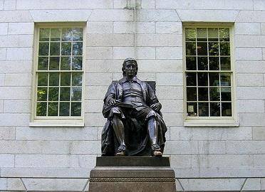 老远看一黑色雕像,右脚闪闪发光。很多人围着。这是哈佛先生的雕像,这个雕像虽然标注着哈佛先生的名字,但雕刻的并不是哈佛先生本人。由于哈佛先生没有留下任何的影像资料,当后人计划修建这样一尊雕塑时也就没有了模板,只能在当时的哈佛大学里找到一位比较帅的学生作为雕刻的模特,顶替哈佛先生。(这被学生们戏谑为哈佛三大谎言,一雕像不是哈佛本人,二在雕像的碑文上写Harvard college建于1638年是错的,它建于1636年。而且摸他的脚会考上哈佛,都摸成金光闪闪了,也没见几人考上),每年常青藤盟校都会举行体育比赛,哈佛最强劲对手是耶鲁,每年的运动员都来摸摸雕像的右脚,希望能打败耶鲁。