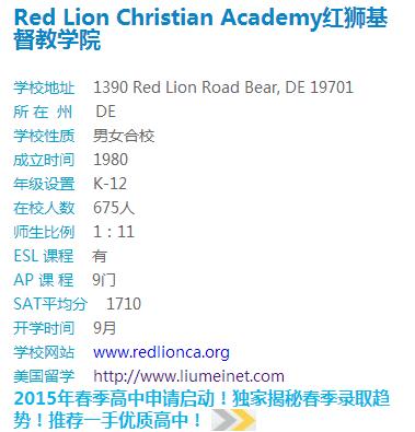 Red Lion Christian Academy红狮基督教学院是一所位于特拉华州的优质混校,提供K-12年级教育,1980年建校,在校生不到700人。学校为英语基础薄弱的学生提供ESL课程。