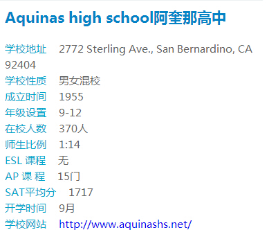 阿奎那高中是一所天主教男女同校,位于圣贝纳迪诺,主要为圣贝纳迪诺教区学生提供教育。阿奎那为学生提供全方位的教育经验,包括精神、学术、体育和社会发展各个方面。学生们积极开发他们的潜能,追求学术卓越来满足他们的需求。通过与家长、教职员们一起在圣餐和其他礼拜仪式的经历来深化信仰。