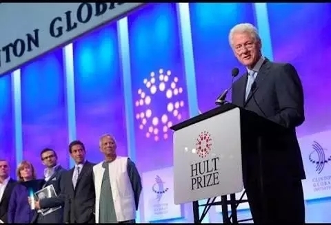 (美国总统比尔克林顿,诺贝尔奖得主尤努斯为霍特商业挑战赛获奖学生颁奖)