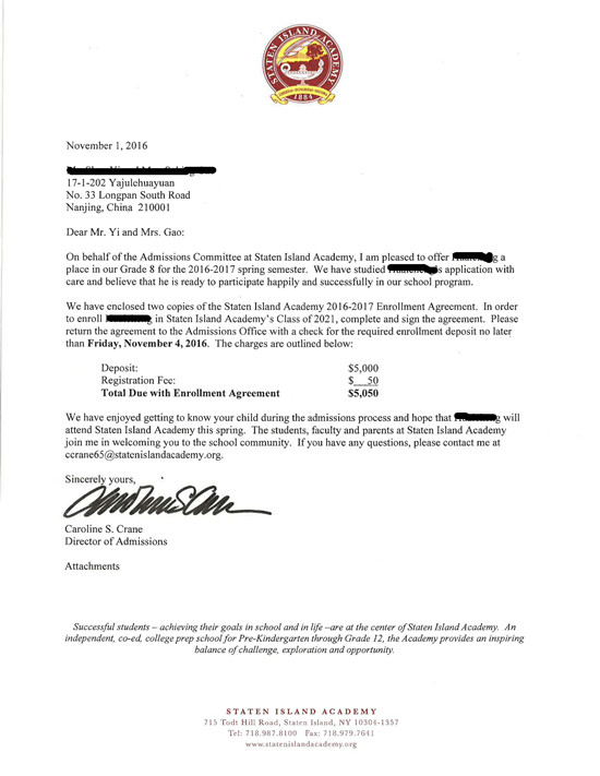 根据易同学和家长的要求,我们给推荐了3所非常不错的学校。但是这3所学校以易同学目前的条件来看,对他来说都很有挑战性,尤其是他最中意的斯泰顿岛中学。于是我们在面试培训方面下了很大功夫,这为易同学的申请加分不少。但即便是这样,在所有申请斯泰顿岛中学的申请人里面,易同学仍然处于明显劣势。最后经过我们反复争取,加上跟学校一直以来密切的合作,终于帮易同学收获了最理想的录取。家长和学生都非常开心,对我们一再表示感谢!