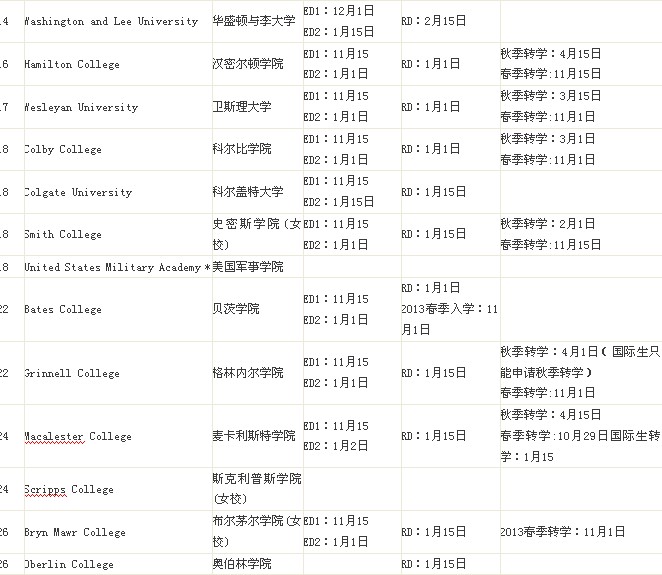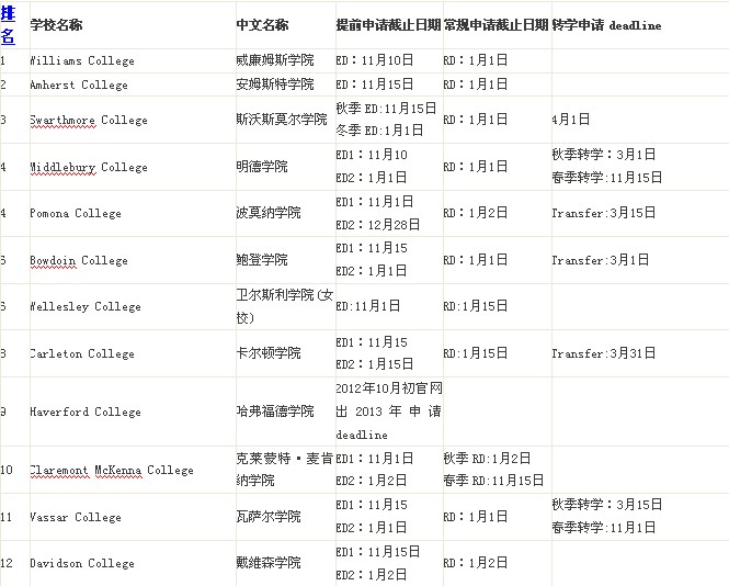 现将2013年美国文理学院申请截止时间做以整理,包括提前申请ED/EA截止日期,常规申请RD截止日期以及转学Transfer申请截止日期。友情提示学子们务必在截止日期之前递交申请材料。因为有的大学标明截止时间为截止日当天的早上八点,有的大学标明如果截止日赶上节假日,那么学生应赶在截止日之前的最后一个工作日递交。迟于申请截止日期递交的材料相当于作废。希望可以为申请2014年美国本科文理学院的同学们作为参考。