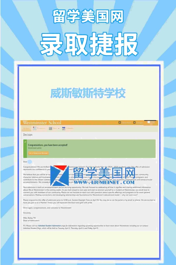 位于康涅狄格州中北部占地200英亩的威斯敏斯特学校,是一个学术、体育精神和领导力都得到良好发展的地方。威斯敏斯特坐落在新英格兰小镇哈特福德以北,步行距离西姆斯伯里充满活力的市中心很近,到纽约和波士顿都很方便,距离布拉德利国际机场仅20分钟车程。