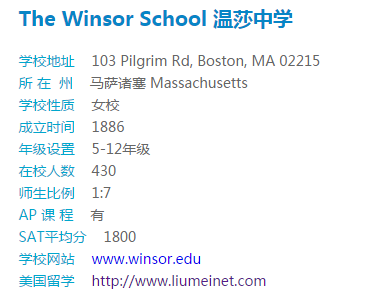 The Winsor School温莎中学成立于1886年,是一所顶尖的日制大学预科走读学校,温莎校园占地7英亩,依偎在西蒙斯和惠洛克学校,波士顿哈佛医学院和许多着名的教学医院旁边。学校可以充分利用周边资源包括州议会大厦,波士顿的公共图书馆。TheWinsorSchool温莎中学也是马萨诸塞州全美最佳女子高中,学校平均SAT:1470,学生人数:437,师生比例:6:1校园活动俱乐部丰富多彩,而且学校位于波士顿市中心位置,交通非常便利。