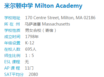 该校创立于1798年,是与两个菲利普中学齐名的顶级中学,位于波士顿城南有8分钟的车程Milton市。学校占地125英亩,环境优美,设施齐全。学生来自美国各地以及世界许多国家。学校开设的年级从幼儿园到12年级都有。教学主要以:科学、艺术、体育为主,是否有AP课程:有,平均SAT:1370,学生人数:1000,学校拥有雄厚的师资团队,教师中有78%持有高级职称。学校尽力创造一个学术自由的环境,避免统一化模式,鼓励创造性、公开性的思想交流。