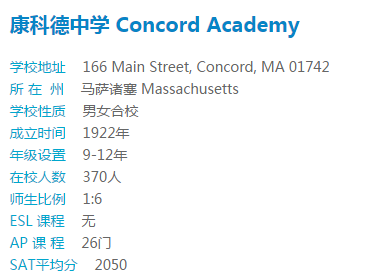 康科德中学Concord Academy成立于1922年。建立之初为女子学校,1971年成为男女合校。康科德高中是一所寄宿、走读的全日制男女合校的着名私立中学,提供1-12年级课程及大学预备课程。学校占地39英亩,优美校园,设备完善。学校PINGJUNSAT:1360,学生日数:382,AP课程:12,并组织了丰富多彩的体育运动及课外活动。学校致力于将学生培养成具有责任感、能用自己的知识为社区做出贡献的良好公民。