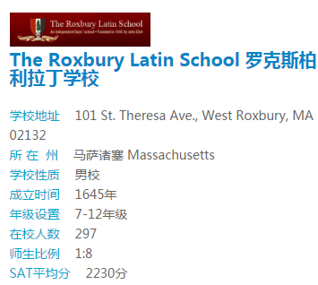 1645年由JohnEliot创立,开设7-12年级的课程,它是在北美存在的最古老的学校,有着悠久的历史,查尔斯国王时期的第一批中学,学校没有宗教背景,由学校提供机会也因此可以从波士顿社会各阶层的一个独特的多元化的学生团体。学校平均SAT:1460,学生人数:302,师生比例:7:1,丰富多彩的课程设置,课外活动主要包括,艺术和运动,让学生们全方位发展。