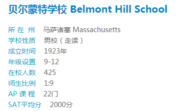 贝尔蒙特学校Belmont Hill School学校建立于1923年,座落于马萨诸塞州Belmont的一个乡村里,一处有32公顷的校园。这所学校提供先进的设施,在学术上,田径运动和艺术上提供广泛且丰富的课程。BelmontHill学校的严谨教育,思想行为习惯,其着重点都放在学生学术上的提高。学校为毕业生提供一生的学习。作为一所男校,我们要以知道男孩子们的思想,行为,在一个集体里的个性发展而感到自豪。在这里男孩子们学会学习,思考。学校平均SAT:1390,学生人数:431,师生比例:7:1,贝尔蒙特学校BelmontHillSchool提供的年级从7年级到12年级。大多数的走读学生住在离学校较近的地方。