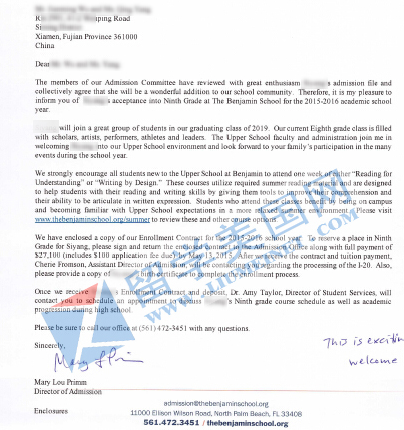 本杰明学校是美国杰出的大学预备中学之一,位于美国佛罗里达州富人聚居的棕榈滩(Palm beach),是当地最优秀的私立贵族走读中学,学习环境和社区条件十分优越。学生家庭90%以上为当地中产阶级以上白人富裕精英家庭,其中不乏世界上负有盛名的美国名人子女。国际生很少。学校有最新技术和培训在电视演播室广播和视频制作方面。