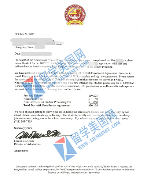 好消息:恭喜Z同学成功申请到Staten Island Academy!这个offer来之不易,凝聚了留美网全体员工的努力和付出,因为Z同学申请的是2018年春季入学,时间非常紧急,从文书写作到预约面试,面试培训,文案老师加班加点,最终帮Z同学拿到了录取!祝愿Z同学在美国展翅高飞,前程似锦!想申请的可以马上咨询:400-000-7805,010-65183908,微信:liumeinet2014