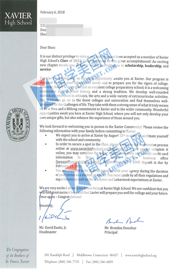 大家好!为大家分享一个好消息!刚刚得到消息!WS同学成功获得 Xavier high School 录取offer!恭喜他!目前泽维尔学校还有1个名额,想申请的同学可以马上咨询:400-000-7805,010-65183908,微信:liumeinet2014