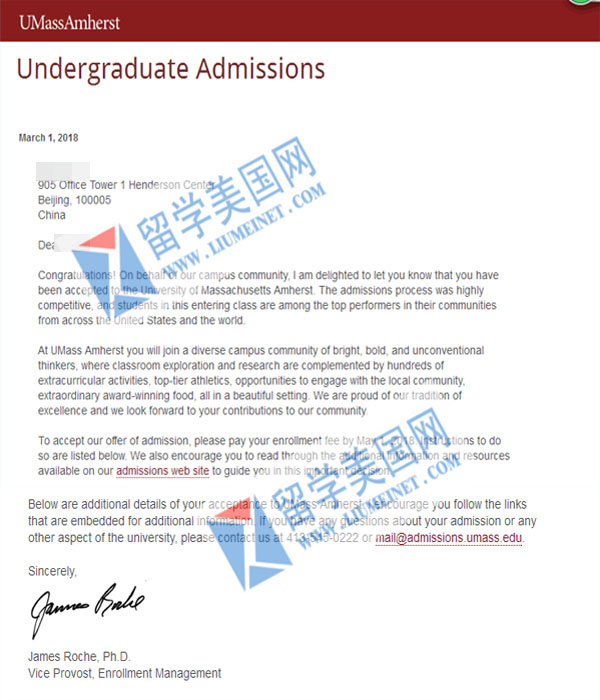 马萨诸塞大学安姆斯特分校)录取offer,并获得4万美金奖学金!祝X同学在美国学业有成!凯旋而归!咨询热线:400-000-7805,010-65183908!微信:liumeinet2014