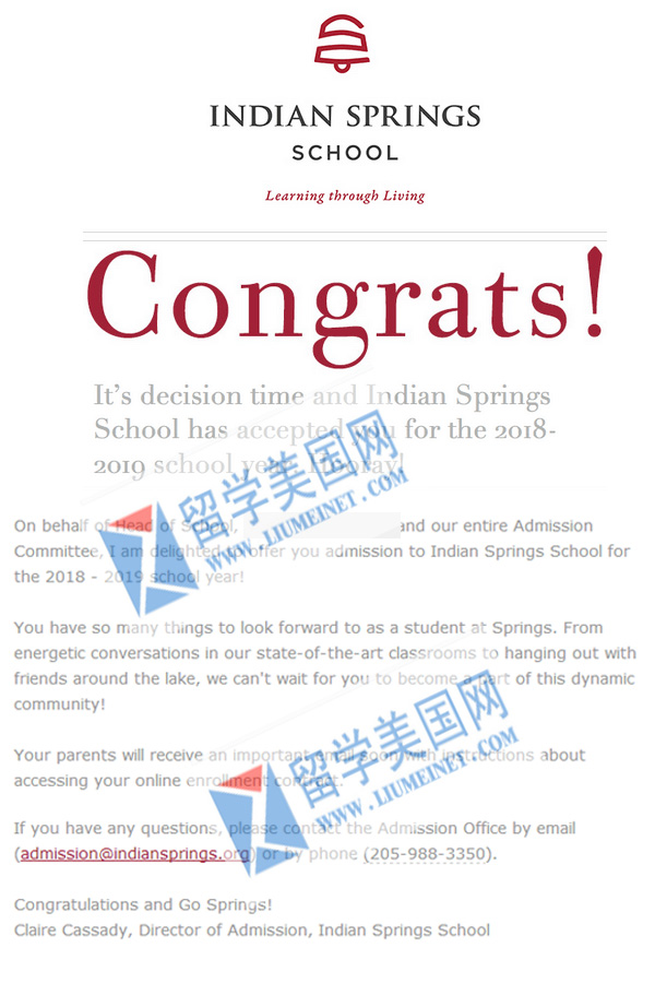 好消息:恭喜留美网同学成功补录到顶尖寄宿学校 India Springs School 印第安泉中学(寄宿排名58!AL州排名第一)。一周内拿到录取!美国补录专线:400-000-7805,010-65183908,微信:liumeinet2014