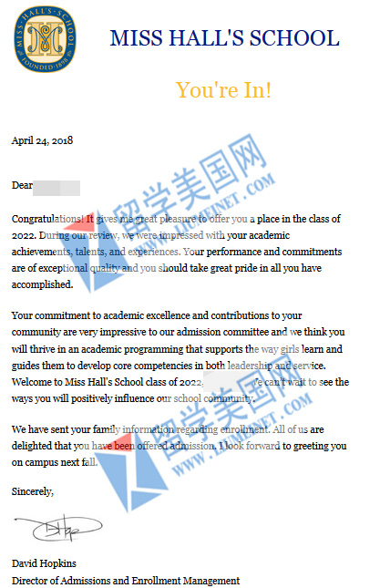 恭喜留美网同学补录到顶尖寄宿 Miss Hall's School,在这里祝张同学前程似锦!学业有成!展翅高飞,美高补录申请火爆进行中,前三十的顶尖走读和寄宿还有位子,申请热线:400-000-7805,010-65183908,微信:liumeinet2014