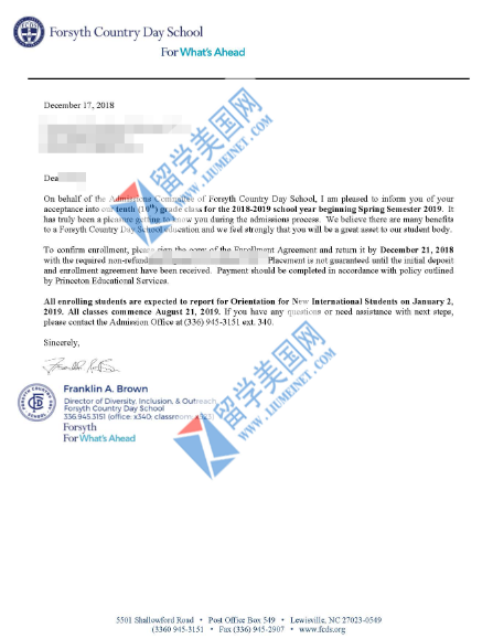 大家好!刚刚得到一个好消息!留美网同学申请到北卡顶尖走读高中Forsyth Country Day School!