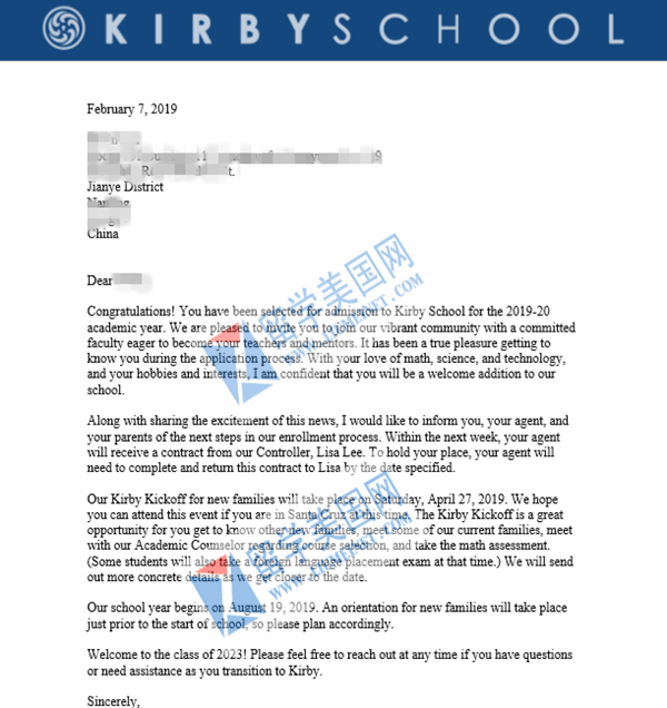 留美网L同学喜获乔治亚娜布鲁斯柯比预备高中offer