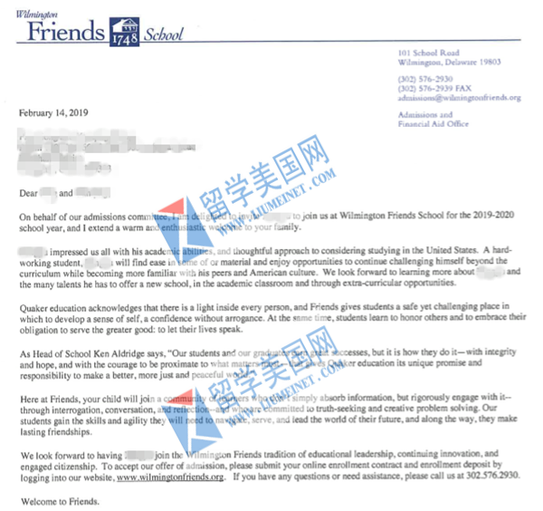 恭喜留学美国网W同学斩获威明顿友好高中( Wilmington Friends School )offer