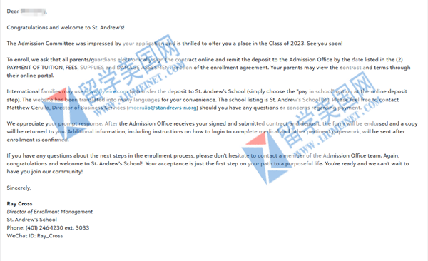 恭喜留学美国网C同学斩获圣安德鲁学校offer
