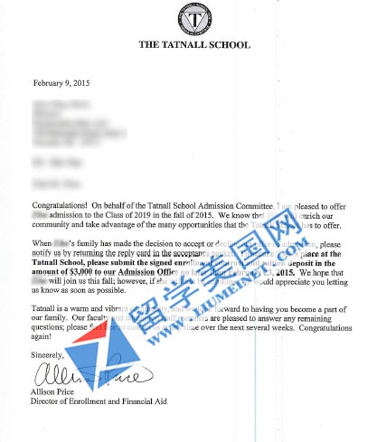 恭喜W同学获近费城好高中TATNALL SCHOOL录取!