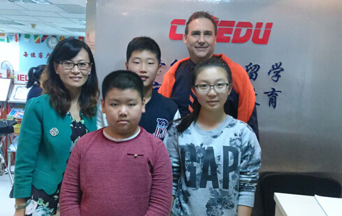 石老师与本杰明招生官及几名小学生合影。最小的小朋友在读5年级。