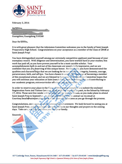 恭喜广州的HZX同学,获波士顿圣约瑟夫中学录取!陆续还会有录取出来哦!