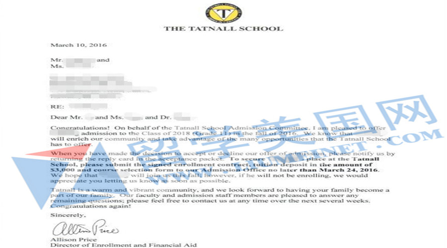 恭喜留美网学员李同学获得优质走读中学塔特龙学校Tatnall School的offer。