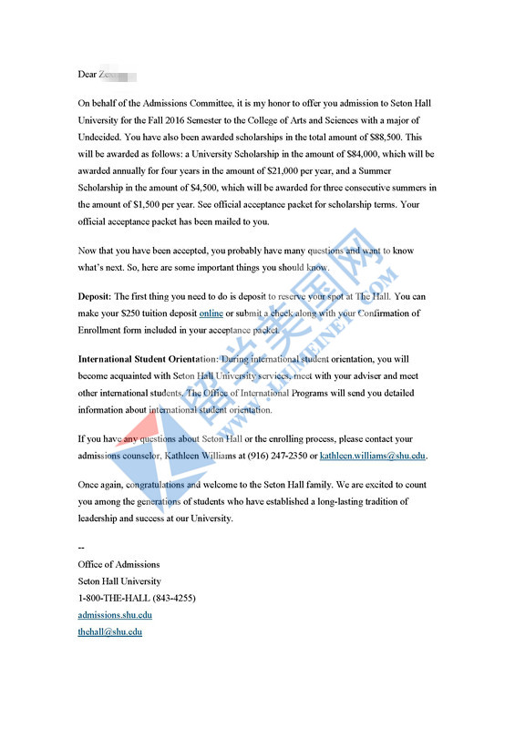 恭喜留美网SZX同学被美国名校Seton Hall University全额奖学金录取