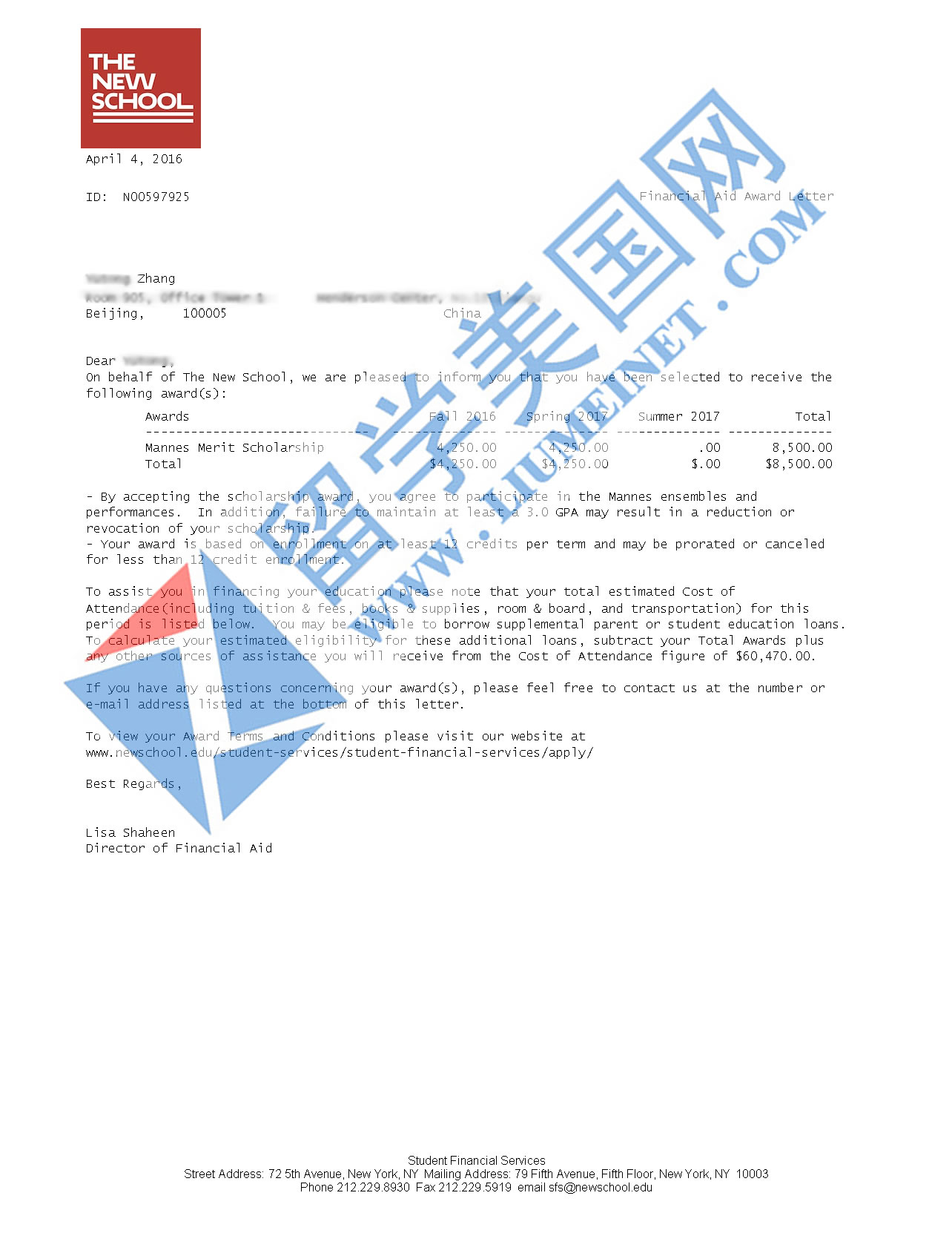 上图为ZYT同学曼尼斯音乐学院奖学金