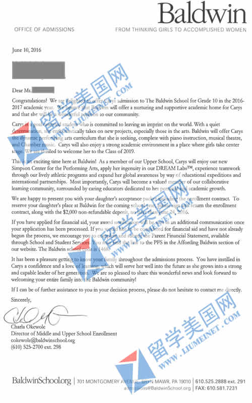 留美网的学生LJX的同学被美国顶级中学鲍德温学校录取!!祝贺她!!第一时间分享OFFER!