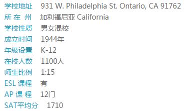 安大略省基督教高中建于1944年,位于加利福尼亚州安大略省,是美国著名私立高中。学校距洛杉矶国际机场和洛杉矶市中心约一小时。这所占地30公顷的校园包括最先进的科学中心,音乐礼堂,足球场篮球场及教学楼,致力于学生知识和善良的培养,它旨在把学生的学术能力,对知识的好奇心和良好品格培养结合起来。