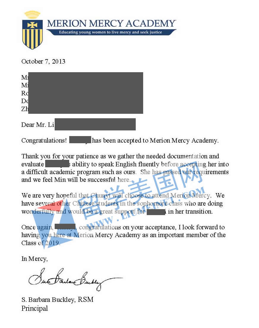 LCY同学的满意评价表和费城百年蓝带女校Merion Mercy Academy录取offer展示 【学校考察详情】