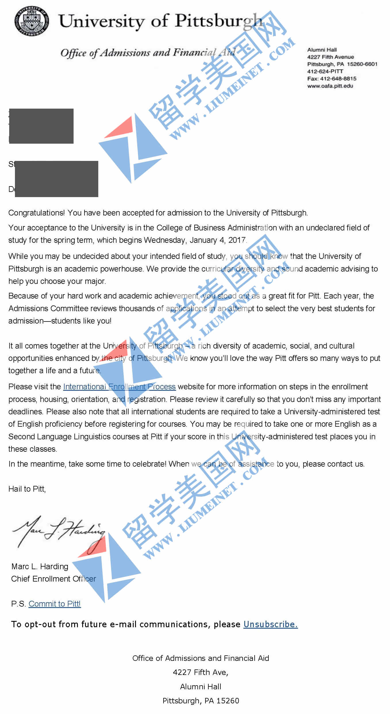 恭喜留美网WZH同学获得University of Pittsburgh匹兹堡大学录取Offer