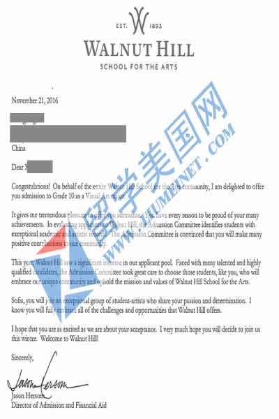 恭喜留美网LXN同学获得胡桃山艺术高中offer