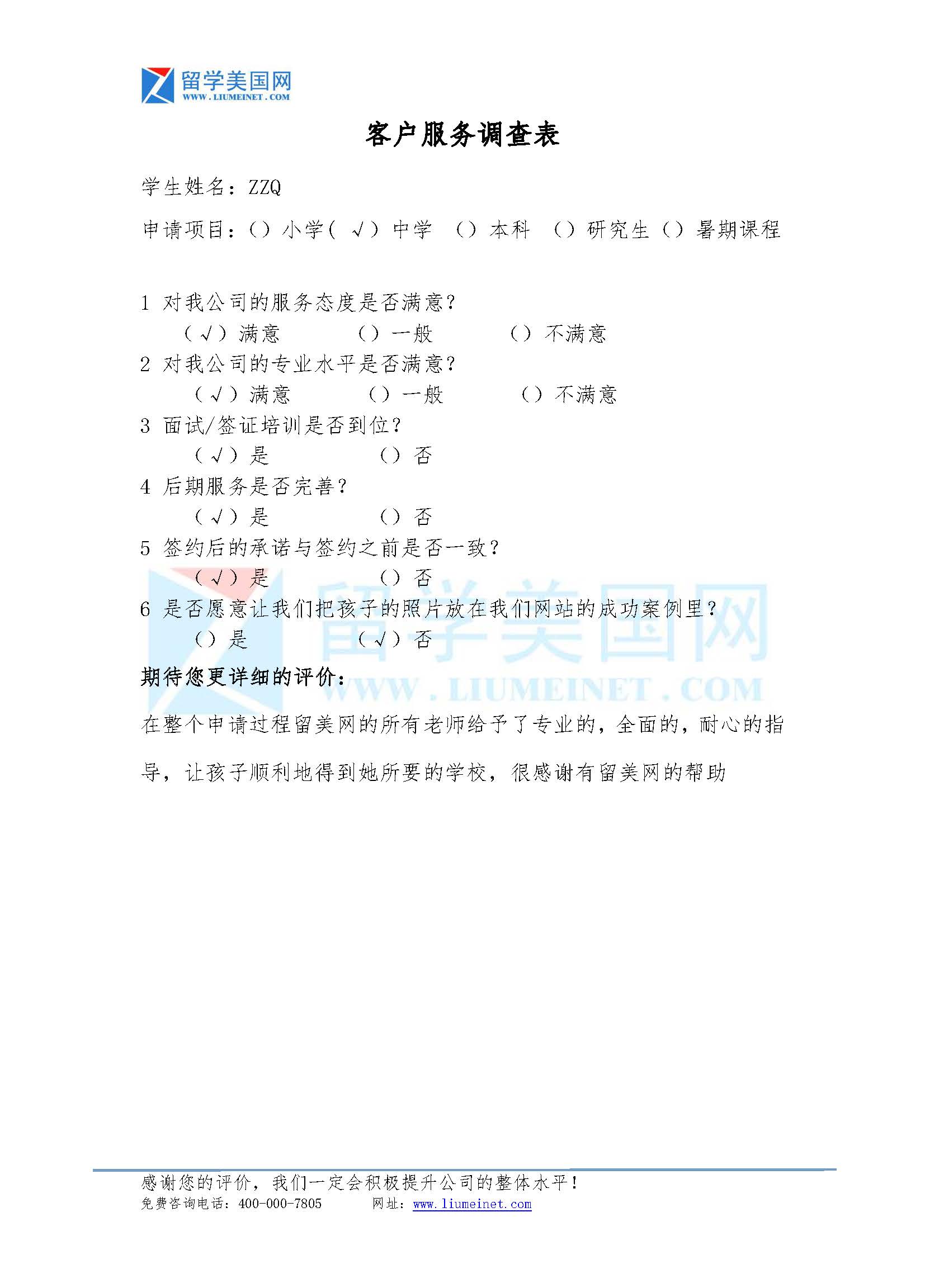 下面是ZZQ同学家长反馈: