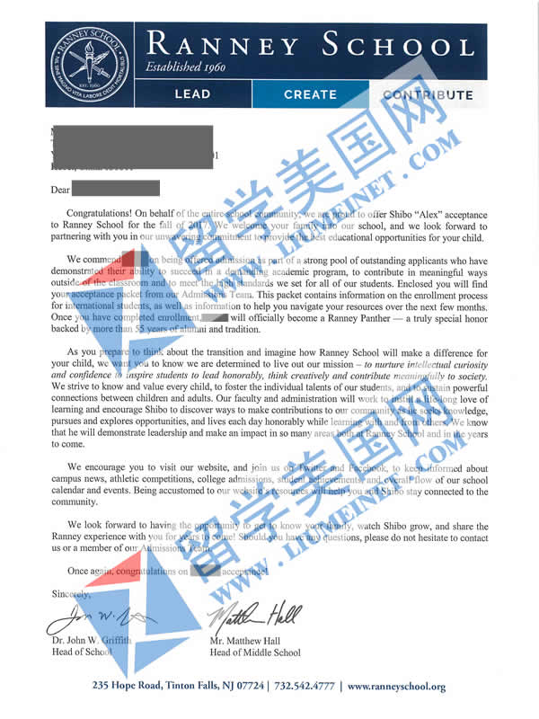 恭喜ZSB同学获得Ranney School 兰尼学校录取offer