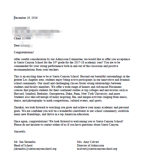 恭喜X同学成功拿到Sierra Canyon School录取offer