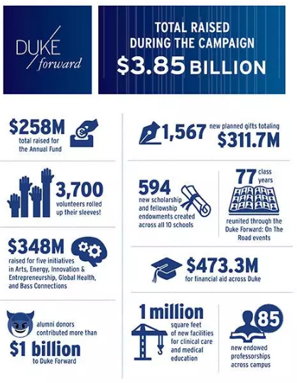 杜克大学最近骄傲地汇报了下自己最近7年的战绩。从2010年7月1日到2017年6月30日,学校组织的Duke Forward募资活动已经收到来自315000位捐款人共计38.5亿美元的捐款,远远超过当初学校定下的32.5亿美元的目标。其中最大的一笔现金捐款5.81亿更是创下了历史新高!而且,值得一提的是,所有募集的捐款中有超过10亿元是来自杜克的校友,果然,校友的力量是巨大的!
