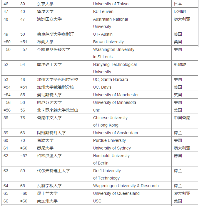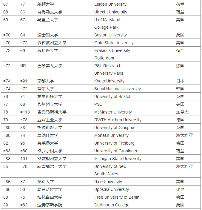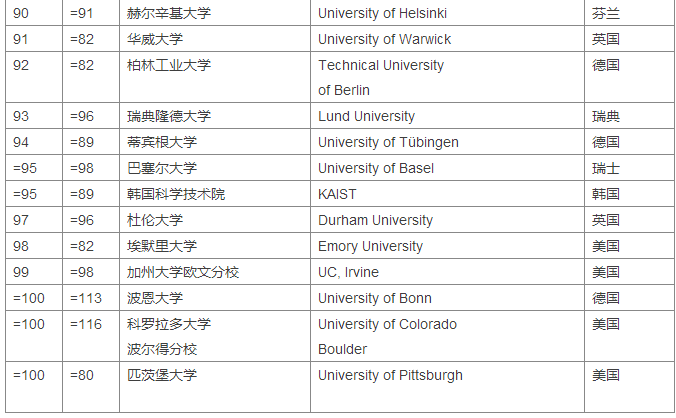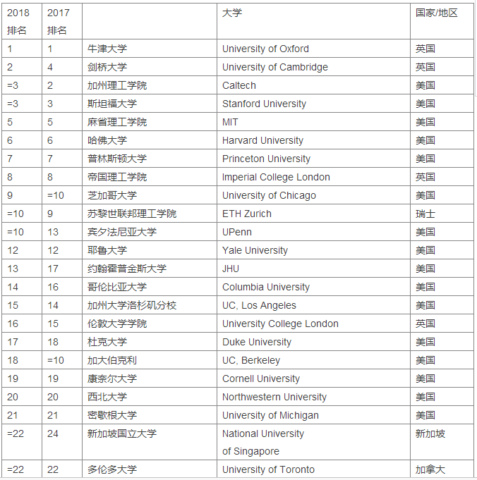 2018Times世界大学排名Top100
