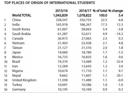 中国依然是最大生源国,2016/17年度留美人数超过35万,几乎是印度的两倍!接下去在美留学生人数最多的依次是韩国、沙特阿拉伯、加拿大、越南、中国台湾、日本、墨西哥和巴西。