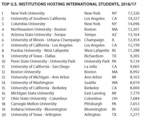 纽约大学连续四年国际学生人数排名第一。南加州大学仍然是第二大领军人物。哥伦比亚大学、东北大学、亚利桑那州立大学、伊利诺伊大学香槟分校、UCLA、普渡大学紧随其后。综合来看,人数排名前25的高校拥有的留学生占全美留学生总数的22.4%。2006/07年度,国际生人数超过1000的美国高校有156所,2016/17年度,这个数字增加到了250所。