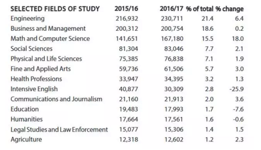 STEM依然是最热门专业,工程专业就读人数去上一学年增加6%,数学和计算机科学就读人数上升18%。商科管理虽然是第二热门的专业,但增幅不如工科类专业。下降幅度最大的是上英语强化课程的人数。教育专业人数也在减少。说明现在留学生选择专业越来越务实,会更多考虑未来就业。