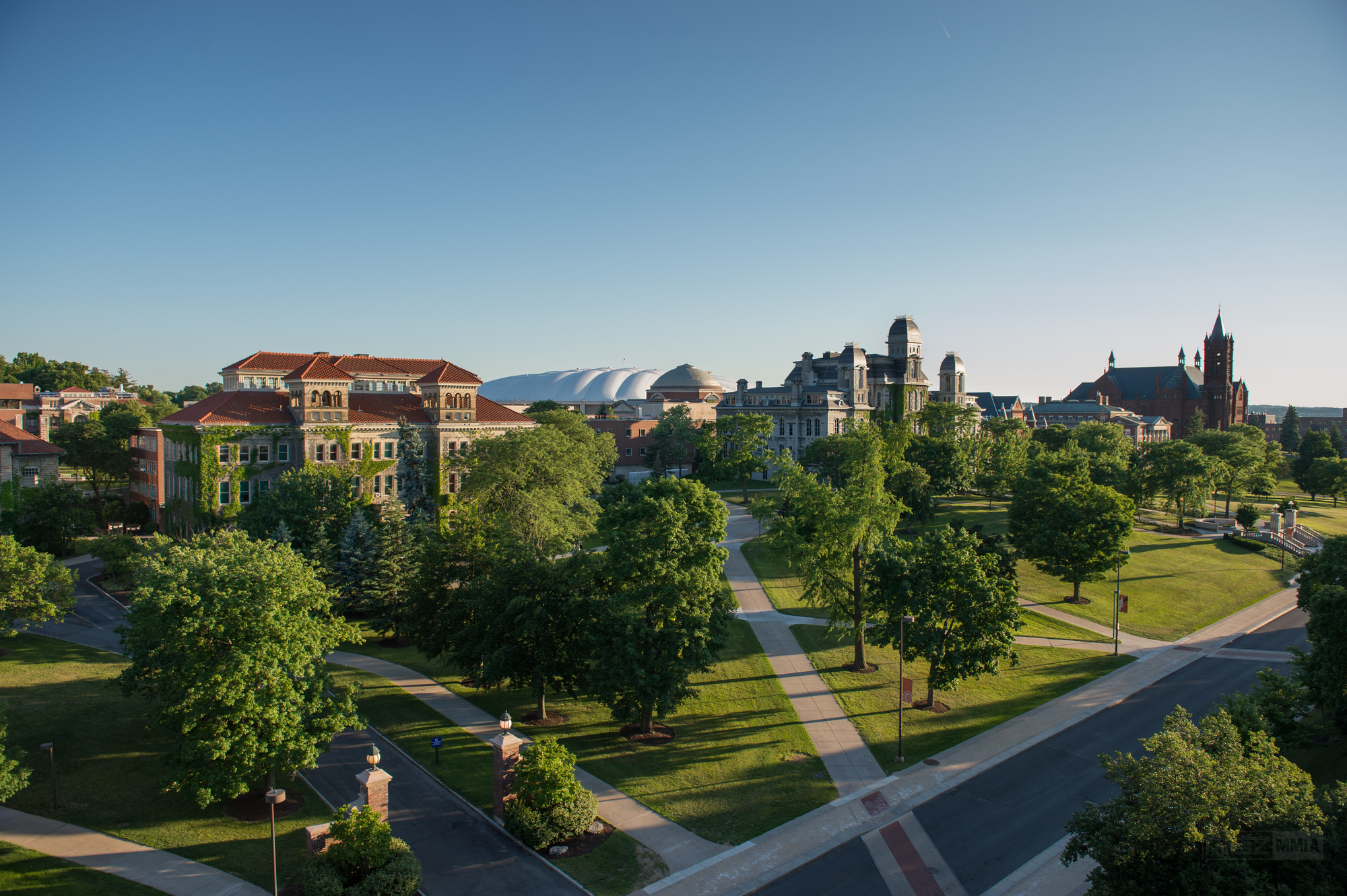 2、学校校园位于大学山,在东部和东南部的市中心附近较大的山丘上。其特点是各时代建筑的最佳组合,从19世纪罗马式建筑到现代的建筑。雪城大学由13个学院组成,信息研究和图书馆学、建筑、通信、工商管理、公共管理等项目获得联邦高度认可。
