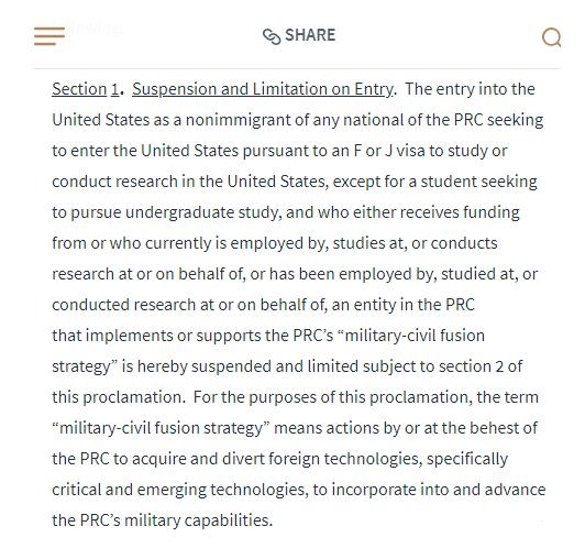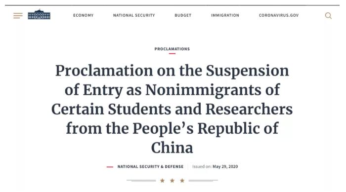 美国白宫公告:6月1日起禁止部分中国留学生和研究人员入境 公告称,这些人员想透过F签证或J签证进入美国求学或从事研究,将对美国不利,必须加以限制。这项命令将从美东夏令时间6月1日午夜起生效。 文章转载自公众号 美藤国际教育 有影响已经是不争的事实,但具体影响到什么层面? 从白宫这份文件中我们可以看出: 1、明确是针对中国留学生和访问学者的( F 和 J 签证); 2、限令的对象主要是赴美读研究生和博士,赴美读本科不受影响; 3、这些读研和博的学生来自军民融合背景的院校(本科是英澳等国就读的学生也不受影响)。 Section2 列了大量例外条件: 1. 绿卡持有者不在限制范围内。 2. 美国公民以及绿卡的配偶不在限制范围内 3. 美军及其家属,子女不在限制范围内。 4. 国际法适用的一些外国人不在限制范围内。 5. 各种特批与难民不在限制范围内。 川普的行动也受到美国各界的反对,对此,中国留学生比例占20%的康奈尔立即发表声明,表示了反对。 现在大家最关心的是:现在在美国的中国留学生,尤其是那些本科在相关中国大学就读过、工作过的人,会不会遭到驱逐?其他的小留学生、即将赴美上本科的留学生,会不会受到波及?下面小藤为大家解读相关问题。 国际学生包括哪些签证类型? 国际学生,包括F类型签证,J类型签证。 F类型签证是全时国际学生,每个学期必须注册满12个学分的课程,配偶和家人在美国不能工作。F签证没有时间限制,只要是全时学生,可以一直读下去。 J类型签证是访问学者或者访问学生,对注册课程没有要求,有严格的时间限制,比如访问学者身份,一般一次只给一年,每年要延期,而且最长不能超过5年。访问学生,比如高中学生,或者是本科学生,一般都是在一年之内。J类型签证,一般都有回国服务两年的硬性要求。 除了本科,中国学生都要驱逐出境? 入境限制不包括人群:本科学生。这应该是说,本科学生,并没有能力“偷”,其实,是本科学生,难以得到中国公费的支持。 同时,高中学生,自然也被排除在外了。 入境限制包括的人群:本科以上的国际学生或者访问学者,而且这些人的经费,得到中国的军事相关项目提供。 中国在美国的留学生,有36万人之多。 各位能猜一下,多少是公费,多少是自费的吗? 有98%的中国学生,包括F和J,都是自费的。都是留学生自己出的钱。他们这些自费留学的资金,和“中国的军民融合发展战略”经费,有啥关系? 也就是说,这个规定,最多只是限制了2%的中国留学生和访问学者来入境美国。 OPT 要“被取消”? 其实,OPT、H-1B 被列入整治名单不是一天两天的事儿了。几乎每隔一段时间,都有 OPT 要被取消的新闻出现: 2018年1月,国土安全局宣布 H-1B 改革进程将在2018年全面展开,各家媒体分析STEM 专业长达36个月的 OPT 特权将被没收、H-1B 的六年延期将被取消。以响应特朗普在“买美国货,雇美国人”行政令中的对 H-1B 改革的号召。 2018年8月,特朗普著名的中国留学生”间谍论“诞生,外媒纷纷发布有关留学生间谍论报道。 2019年6月,美国共和党国会议员就提出了一个改革法案——“Fairness for High-skilled Americans Act of 2019”,目的就是取消 OPT 来减少外国劳动力对美国当地人的就业影响。 2019年7月,一则关于 STEM OPT 的诉讼再次开审。WashTech(华盛顿技术工人联盟)在2014年提起诉讼,WashTech 认为国土安全局没有资格为持 F1 学生签证的国际学生制定 OPT 的规则和法律对此,他们甚至希望取消 OPT。 这在当时也算是给留学圈扔了一个重磅炸弹,导致不少家长和学生整天为此担忧。但到目前为止,OPT 依旧完好,诉讼结果依旧是“驳回 WashTech 上诉”。 而2021财年,根据美移民局公布的最新数据,今年参与 H-1B 抽签人数激增到27.5万,比去年同比增长7.4万。 与此同时,H-1B 拒签率也迎来十年之最。 根据美国家政策基金会(NFAP)报告,H-1B 工作签证发放持续收紧、加之“用美国人”的政策下,拒签率达到35%、续签申请的拒签率10%,均达到10年来最高线。 取消 OPT/H1B? 特朗普,你真的敢吗? 不过大家也都知道,特朗普这人翻脸如翻书。 高校收入损失巨大 受新冠疫情影响,国际生申请数量锐减对美国高校的财政造成巨大冲击。纽约时报的相关数据更是直接预计今年美国大学的国际生申请数量将减少四分之一。 留学美国后有机会做短期工作一直是招收外国留学生的一个主要吸引力,如果此时取消 OPT/H-1B,相信赴美的国际生数量更是会骤减。 而国际生正是美国大学学费收入的主要来源,也是美国财政收入的主要来源。 根据 2019 美国门户开放报告 Open Doors 数据数据显示,仅2018-2019学年,国际生就为美国大学贡献了 447 亿美元的学费。 美国各大学都在疯狂亏损了,前段时间纷纷公布秋季开学安排,目的就是为了提高国际生入学率。取消 OPT?呵呵,所有美国大学第一个不同意! 而且,其实特朗普也很急,早些时候表示全美各地学校应该尽早开放。 此外,这项政策这么多年一直悬而未决,是因为反对者也很多。 美国教育委员会负责全球事务的副主席布拉德法恩斯沃思直言:“限制 OPT 计划将发出一个令人不寒而栗的信息,表明我们一直致力于培养国际学生,并吸引最优秀人才来美国的理念出现了松动。” 美国大选年。川普的策略是高举轻放。 这个白宫的声明,名头很大,但是只是影响到了拿中国军方资质的本科阶段以后的国际学生和访问学者的入境。 美国政府不