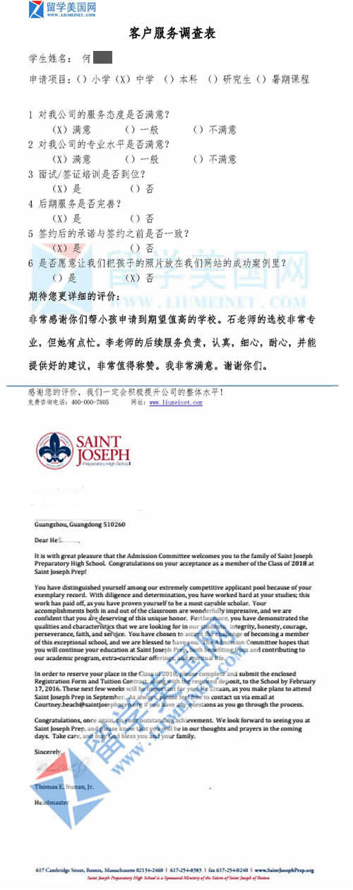HZX同学的满意评价表和波士顿圣约瑟夫中学录取offer展示